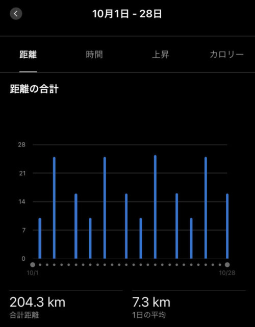 寒くなってくると筋肉が硬くなり、足の色んな所が痛くなりやすいので、いつもは大体、数日間の休息期間を挟んでいましたが、今月はそういう事も無く、200km走り切ることができました。