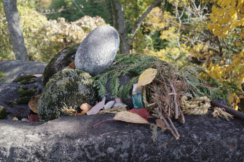 ペットボトルのようなものが見えますが、丸石はどんど焼きの時期に飾り付けたり、儀式を行う事があるので、ゴミではなく、その時にお酒?などをかけるための容器かもしれません。