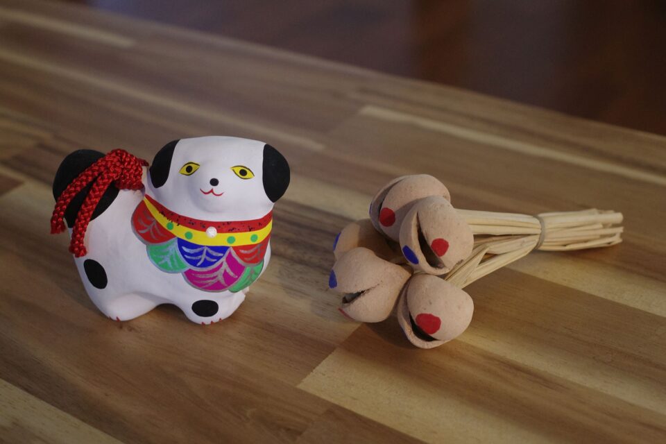 バク子が買った英彦山がらがらという伝統的な作り方の鈴と、ゆるい表情の犬の鈴。